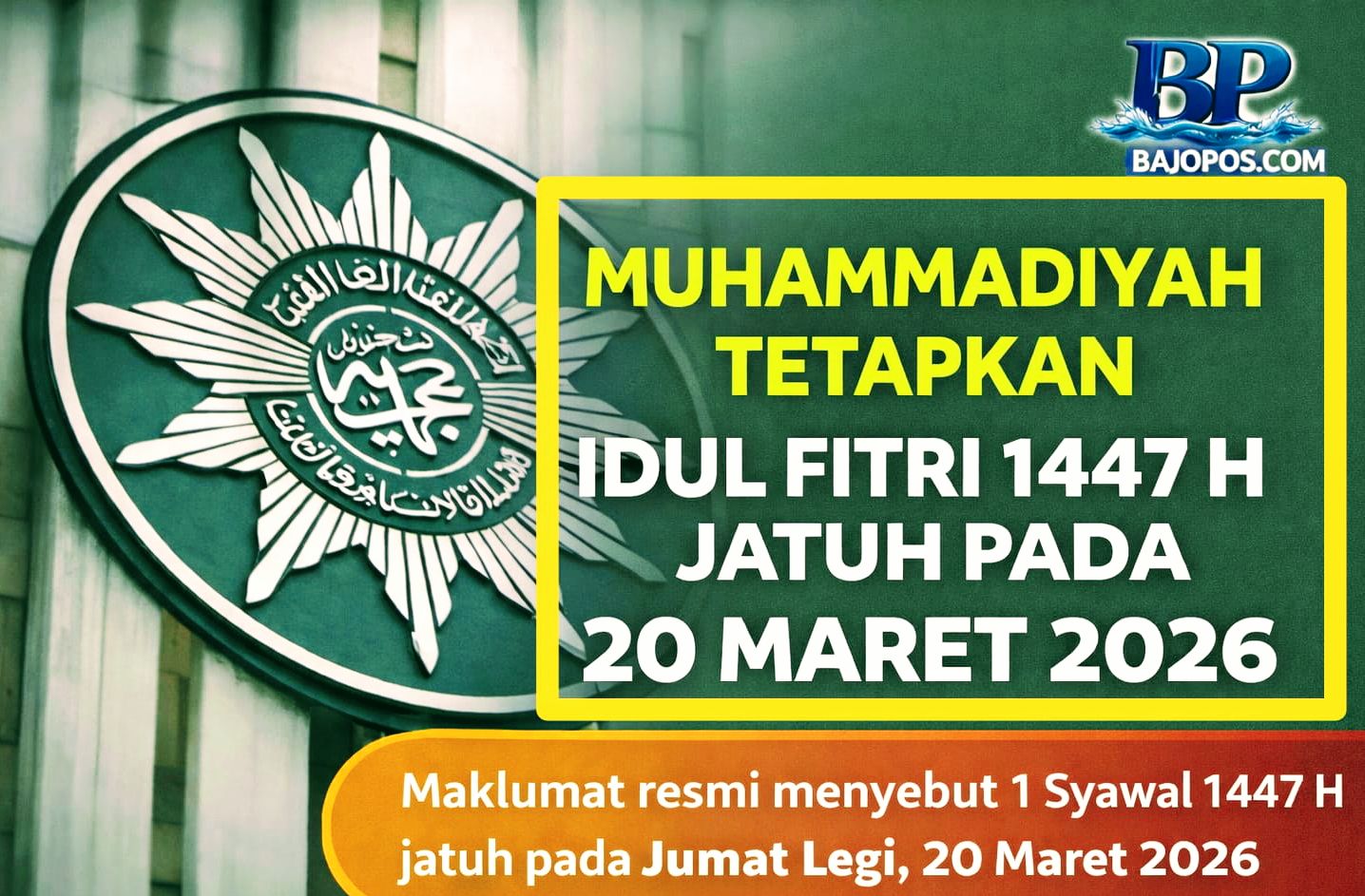 YOGYAKARTA, BAJOPOS.COM – Pimpinan Pusat Muhammadiyah secara resmi menetapkan Hari Raya Idul Fitri 1447 Hijriah jatuh pada Jumat Legi, 20 Maret 2026 Masehi. Penetapan tersebut tertuang dalam Maklumat Pimpinan Pusat Muhammadiyah Nomor 2/MLM/I.0/E/2025 tentang Penetapan Hasil Hisab Ramadan, Syawal, dan Zulhijah 1447 Hijriah.